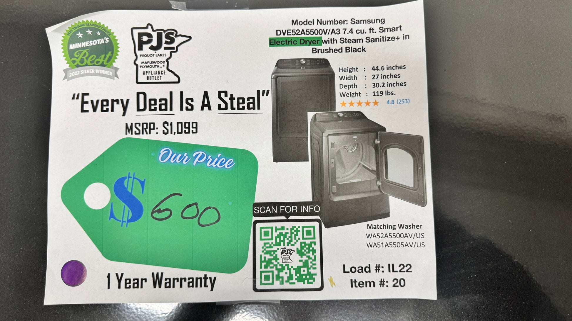 SAMSUNG DVE52A5500V 7.4 cu. ft. Smart Electric Dryer with Steam Sanitize in Brushed Black