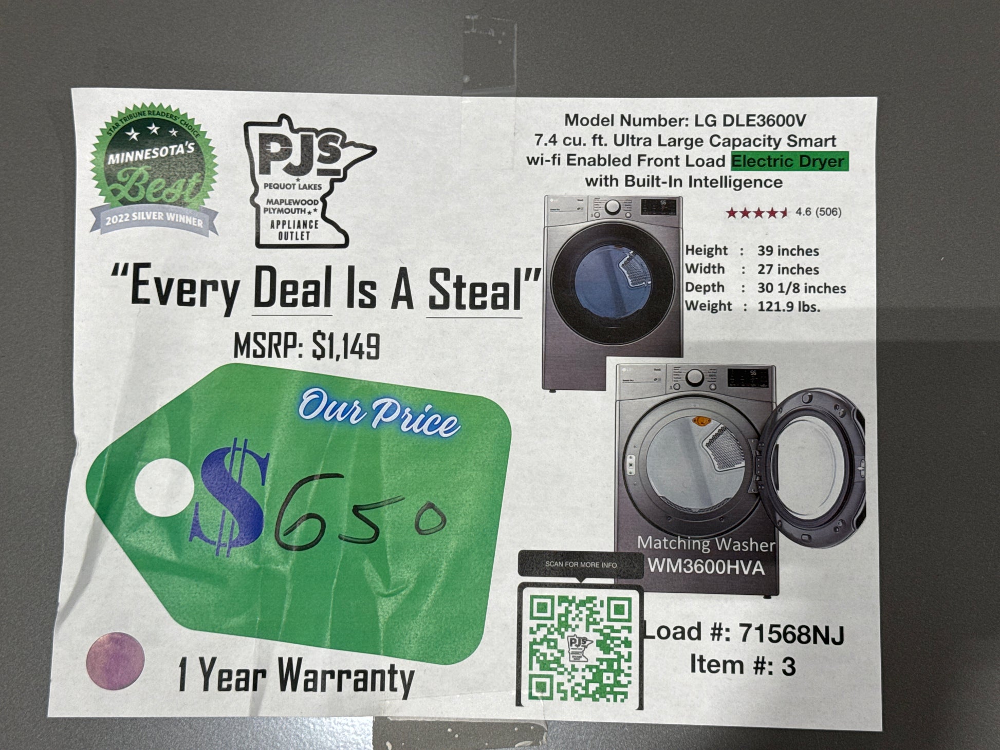 LG DLE3600V 7.4 cu. ft. Ultra Large Capacity Smart wi-fi Enabled Front Load Electric Dryer with Built-In Intelligence