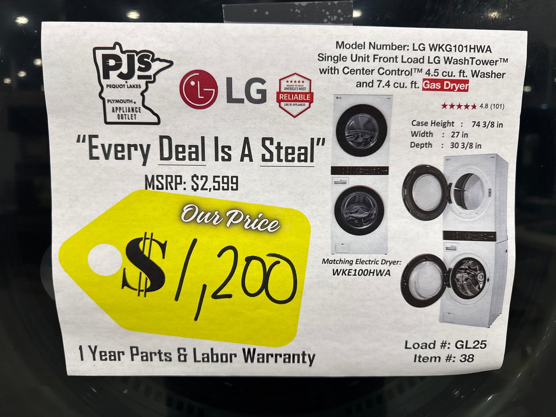 LG WKG101HWA 27 Inch Smart Gas WashTower with 4.5 Cu. Ft. Washer Capacity, 7.4 Cu. Ft. Dryer Capacity, Single Unit WashTower™ Design, Built-In Intelligence, Allergiene™ Wash Cycle, Sensor Dry, and ENERGY STAR® Certified