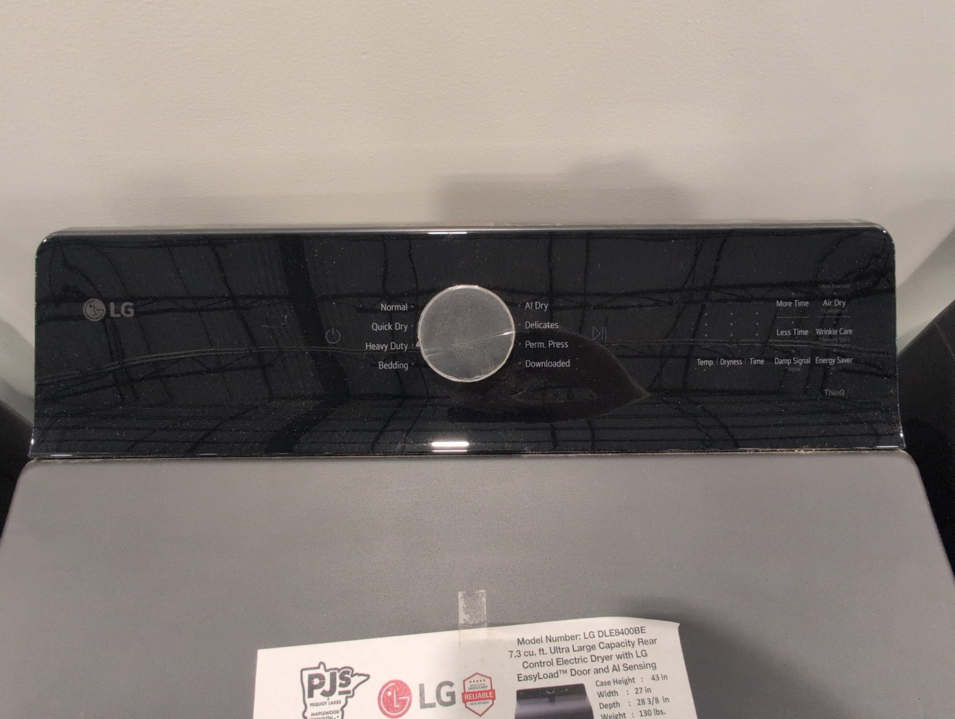 LG DLE8400BE 27 Inch Top Load Electric Dryer with 7.3 cu ft Capacity, EasyLoad™, AI Sensor Dry™, Smart Pairing™, ThinQ® Smart Technology, FlowSense® Duct Clogging and Energy Star Certified