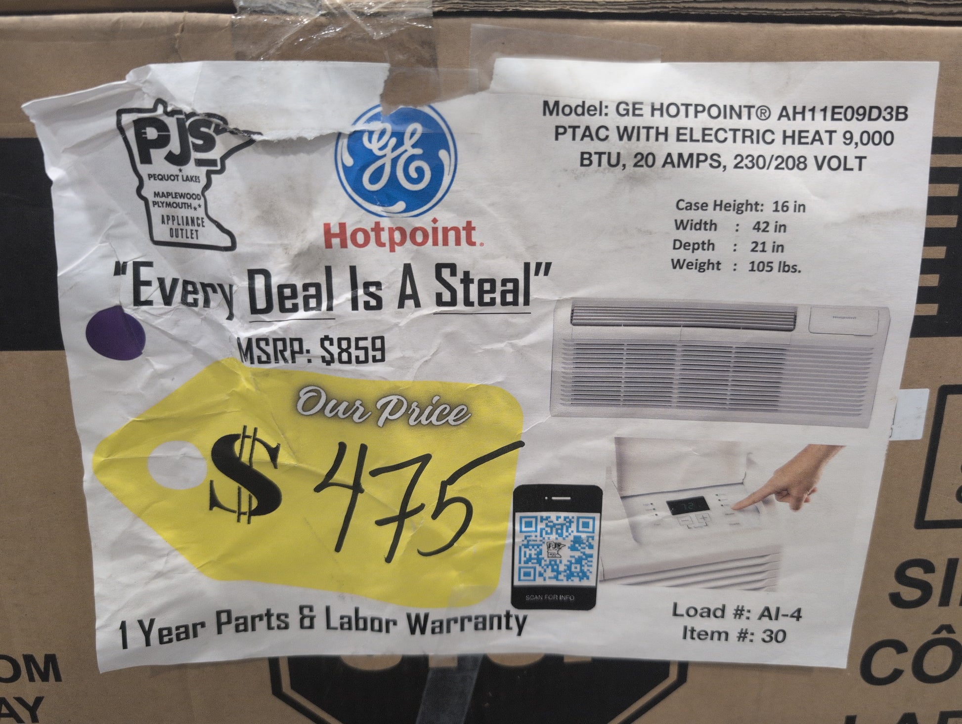 GE Hotpoint AH11E09D3B 9,000 BTU Packaged Terminal Air Conditioner with 10,900 BTU Electric Heat, 3 Speed Fan, Freeze/Frost Protection, Auto Power Recovery, Self-Diagnostic, Easy Control Panel and Power Cord Included