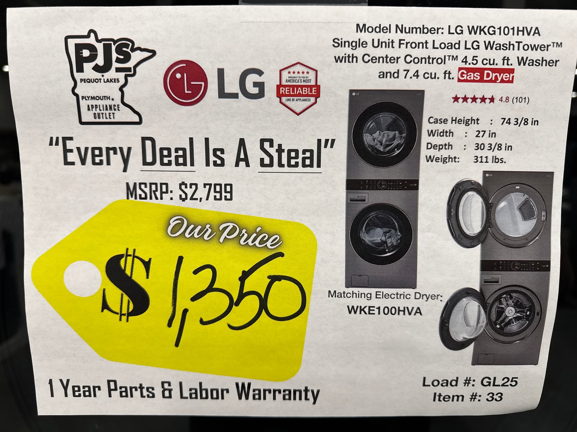 LG WKG101HVA 27 Inch Smart Gas WashTower with 4.5 Cu. Ft. Washer Capacity, 7.4 Cu. Ft. Dryer Capacity, Single Unit WashTower™ Design, Built-In Intelligence, Allergiene™ Wash Cycle, Sensor Dry, and ENERGY STAR® Certified