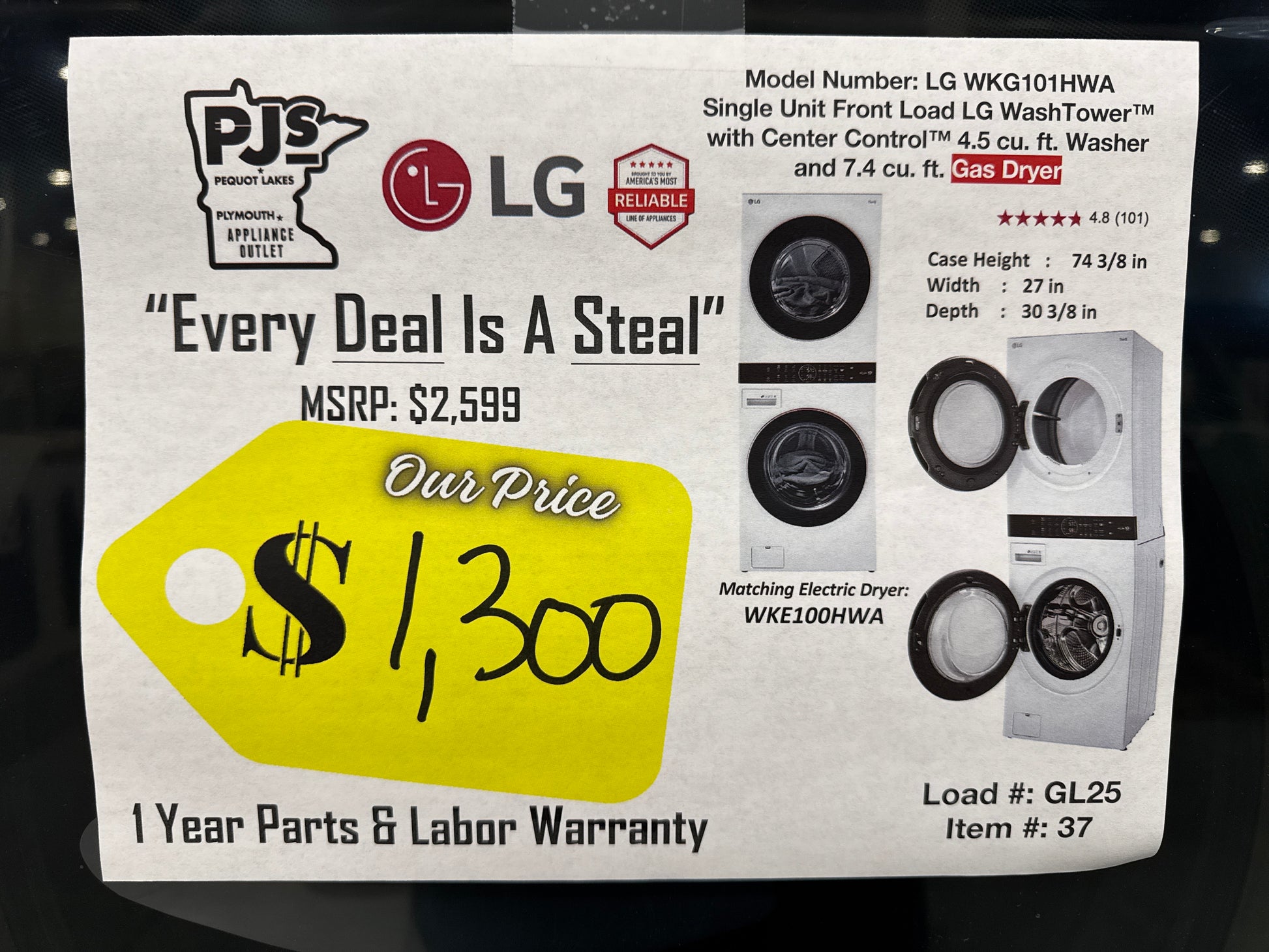 LG WKG101HWA 27 Inch Smart Gas WashTower with 4.5 Cu. Ft. Washer Capacity, 7.4 Cu. Ft. Dryer Capacity, Single Unit WashTower™ Design, Built-In Intelligence, Allergiene™ Wash Cycle, Sensor Dry, and ENERGY STAR® Certified