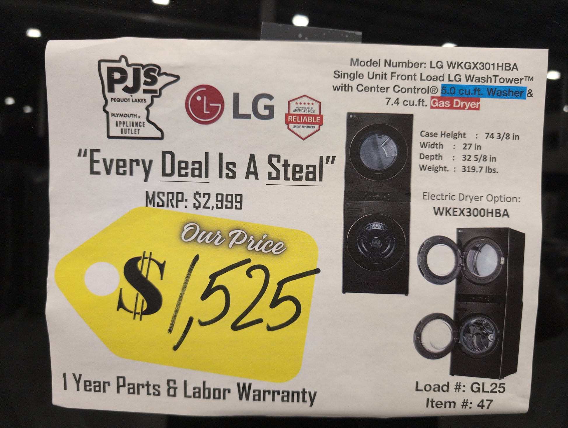 LG WKGX301HBA 27 Inch Smart Gas Single Unit WashTower with 5.0 cu. ft. Washer Capacity, 7.4 cu. ft. Dryer Capacity, AI Sensor Dry, TurboSteam®, Allergiene® Cycle, TurboWash® 360, ezDispense® Dispenser, and ENERGY STAR® Certified