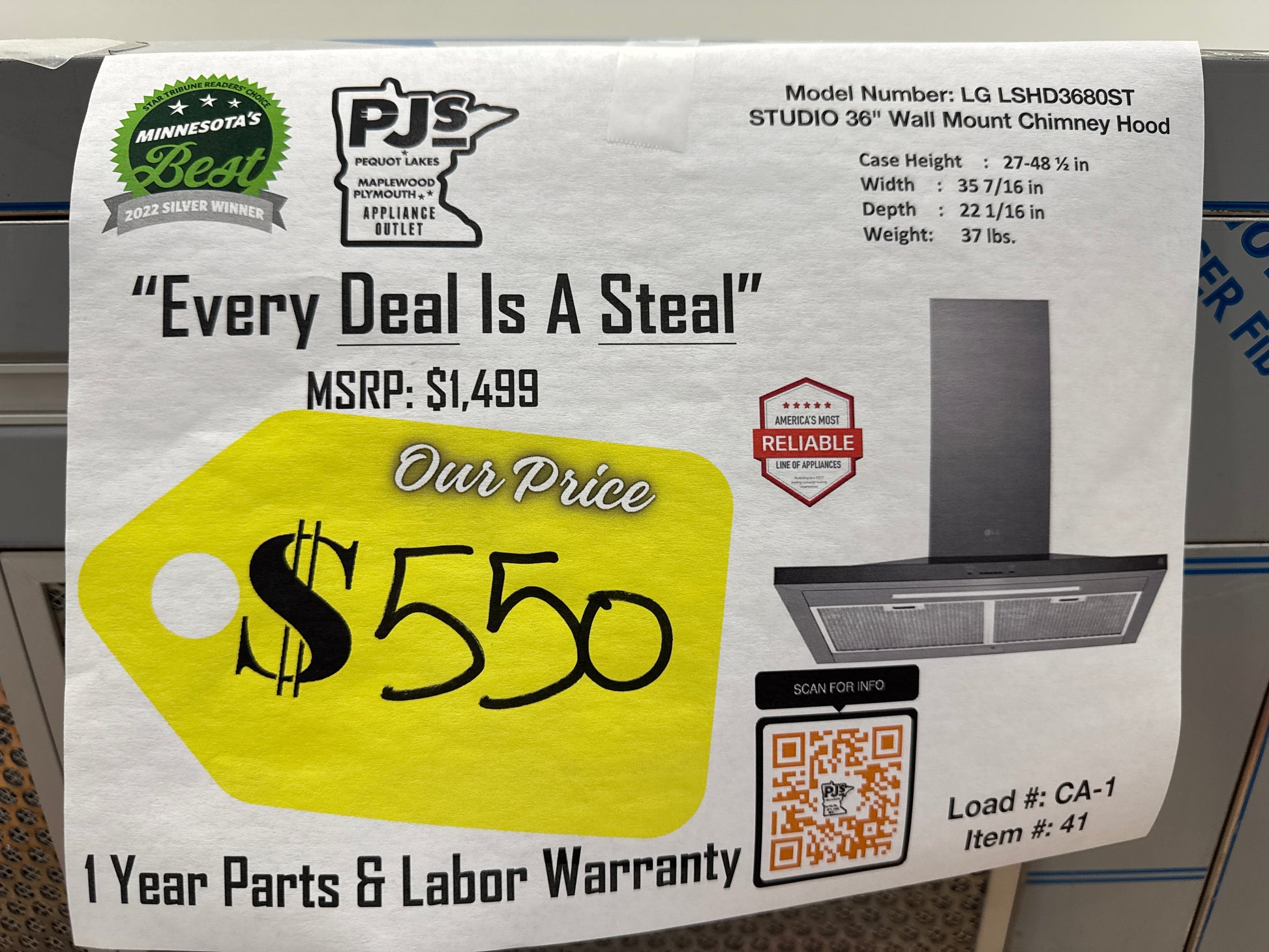 LG Studio LSHD3680ST 36 Inch Wall Mount Smart Chimney Hood with 600 CFM Internal Blower, Wi-Fi, IR Touch Controls, LED Lighting, Mesh Filters, Low-Profile Body, and RoHS Compliant: Stainless Steel